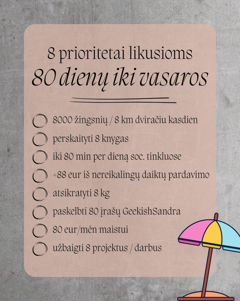 Kad neįkyrėčiau vienodu turiniu, savo progresu (ir nesėkmėmis) planuoju dalintis kartą per savaitę GeekishSandra stories (turbūt pirmadieniais), o įpusėjus – parašysiu išsamesnį įrašą.